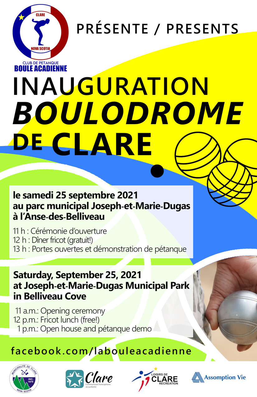 La Boule acadienne Petanque Club and its partners invite you to a community celebration in honour of the inauguration of the Boulodrome de Clare on Saturday, September 25, at Joseph-et-Marie-Dugas Municipal Park in Belliveau Cove.